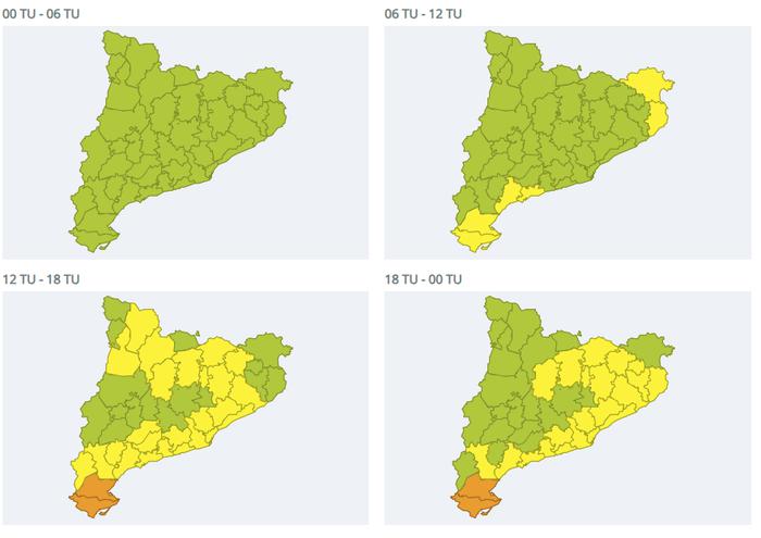 Al sud del territori també es mantenen els avisos d’acumulació de pluja, on es poden superar els 200 litres en 24 hores.