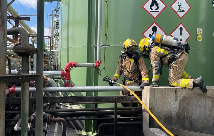 S’ha simulat una fuita d’una mescla de productes amb característiques similars al gasoil, situada al tanc T-301. El vessament ha estat contingut en una cubeta i cobert amb escuma, sense que s’hagi produït cap afectació exterior. Una persona ha resultat ferida durant l’emergència i ha estat atesa pels bombers i pels serveis de la mateixa empresa.